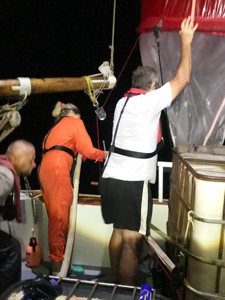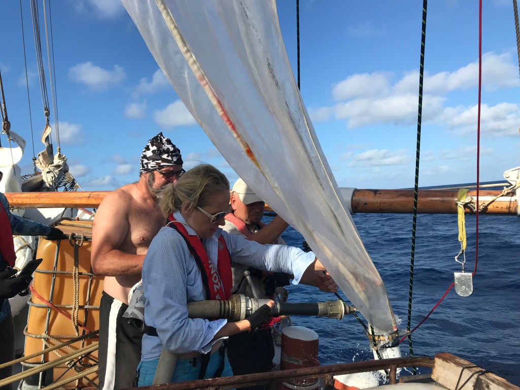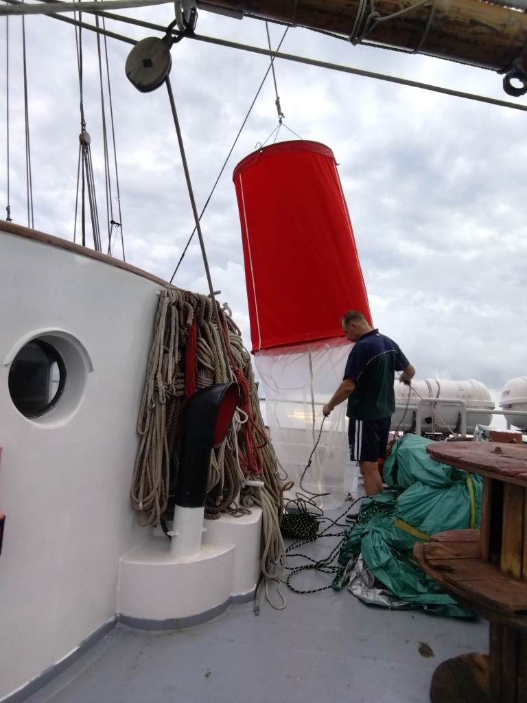 Непросто было найти место для спуска сети. Несмотря на солидные размеры, пространство над палубой шхуны занято вантами, штагами, шкотами, фалами, ниралами и прочим парусным такелажем, ну и самими парусами. В итоге нашли место на баке перед первой мачтой – фоком. Блок для спуска привязали в стаксель-гику, выдвинутому на правый борт, лебёдку поставили в центре, а намотанный фал разместили по левому борту. И вот пришло время попробовать то, что получилось. Спустили паруса, палубная команда во главе со старпомом и мы заняли места у борта, капитан встал на мостике. На первой станции трос уходил в воду вертикально, пробы были отобраны без проблем. А дальше – задули пассаты…