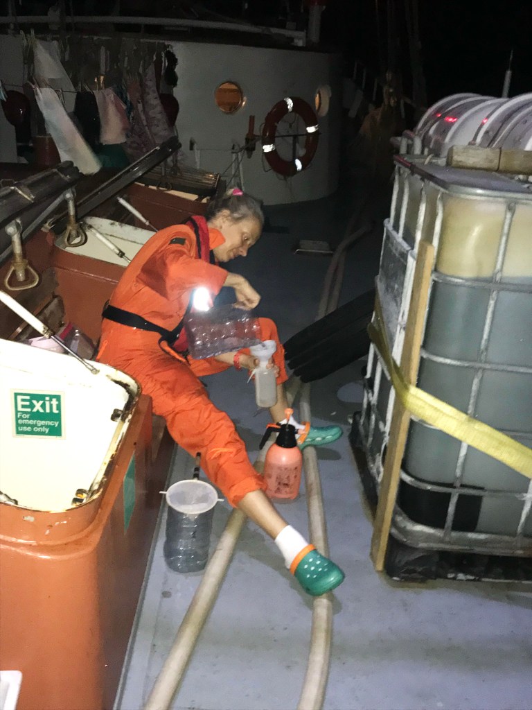 В результате мы всё-таки три раза спускали паруса, ложились в дрейф и сделали 3 станции. Фал уходил за борт под углом 45 градусов – ни о каких количественных ловах и думать было нечего. Зато удалось наловить планктон для фаунистических и молекулярно-генетических анализов – эти райоы океана посещаются нечасто и с каждым годом – всё реже.